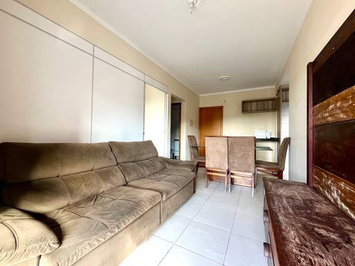 Sala aconchegante com sofá, painel de TV e mesa de jantar